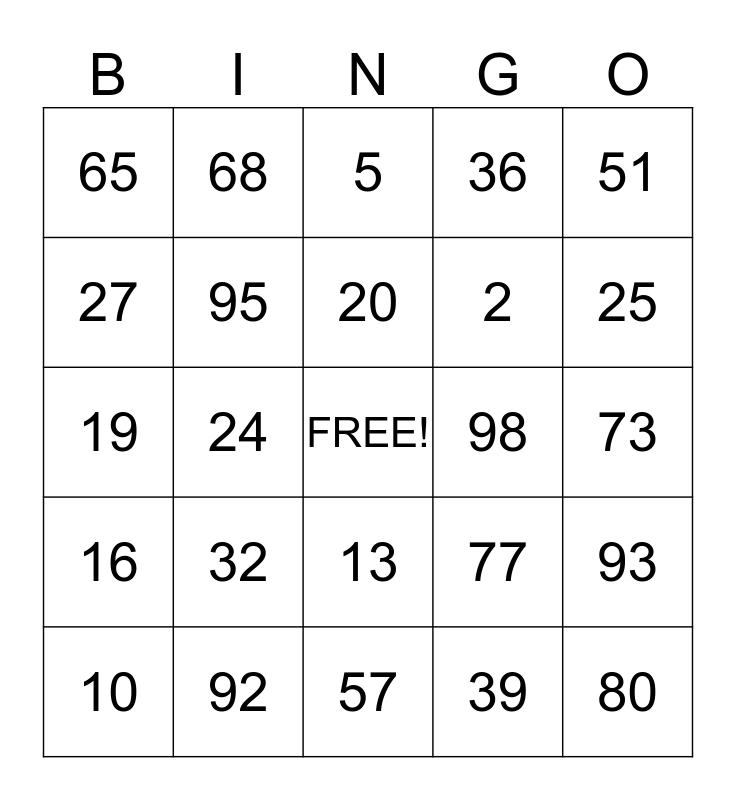 This bingo card has a free space and 24 words: 32, 92, 20, 10, 51, 65, 27, 68, 98, 13, 2, 19, 77, 93, 95, 39, 73, 5, 25, 24, 80, 16, 36 and 57.