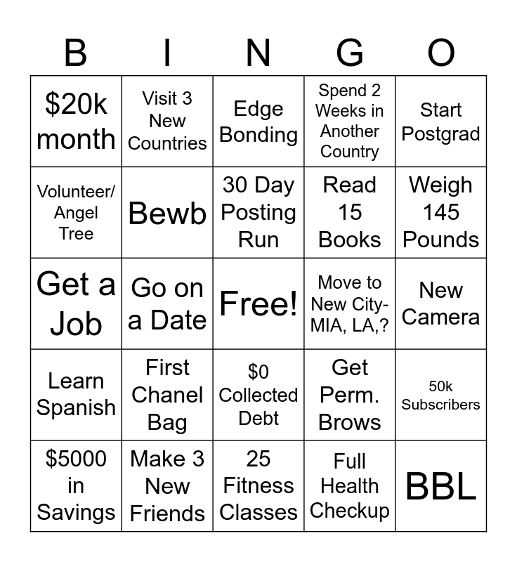 This bingo card has a free space and 24 words: First Chanel Bag, Make 3 New Friends, 30 Day Posting Run, $5000 in Savings, Start Postgrad, $20k month, Volunteer/ Angel Tree, Visit 3 New Countries, Move to New City- MIA, LA,?, $0 Collected Debt, Read 15 Books, Get a Job, Get Perm. Brows, 50k Subscribers, Bewb, Full Health Checkup, New Camera, Edge Bonding, Weigh 145 Pounds, Go on a Date, BBL, Learn Spanish, Spend 2 Weeks in Another Country and 25 Fitness Classes.