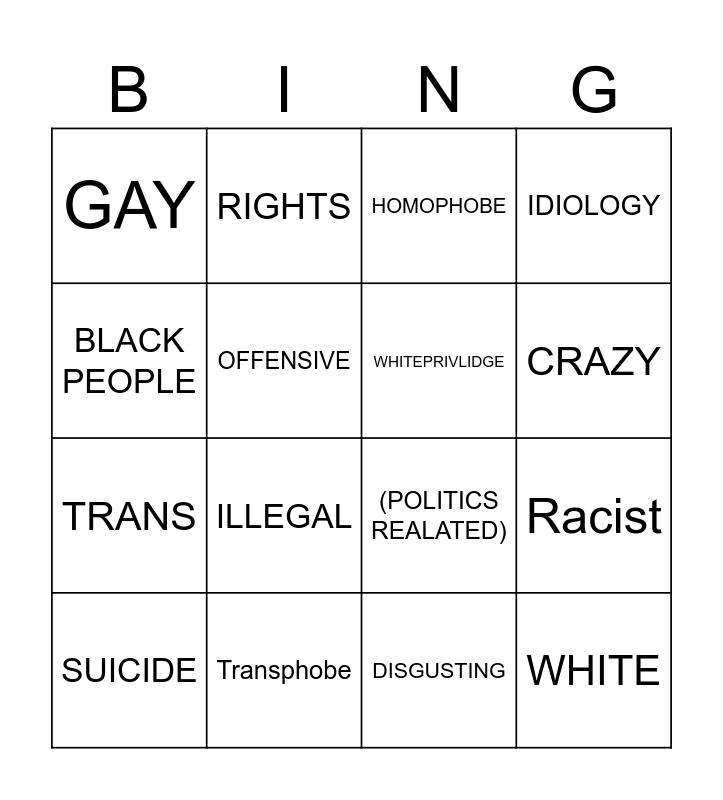 This bingo card has 16 words: Transphobe, Racist, HOMOPHOBE, GAY, TRANS, RIGHTS, (POLITICS REALATED), DISGUSTING, BLACK PEOPLE, OFFENSIVE, SUICIDE, IDIOLOGY, ILLEGAL, CRAZY, WHITEPRIVLIDGE and WHITE.