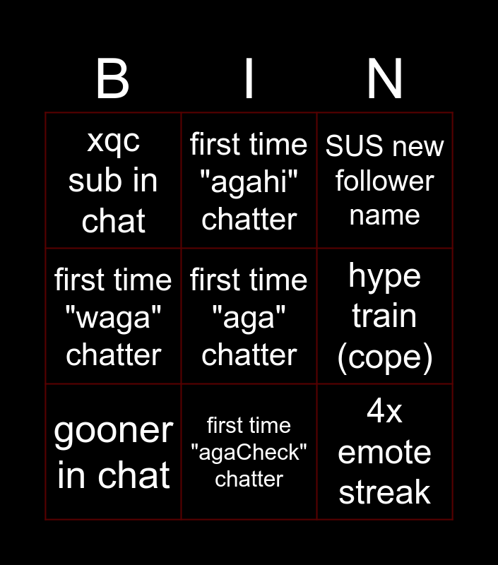 This bingo card has a free space and 8 words: hype train (cope), SUS new follower name, first time "agahi" chatter, gooner in chat, xqc sub in chat, 4x emote streak, first time "waga" chatter and first time "agaCheck" chatter.
