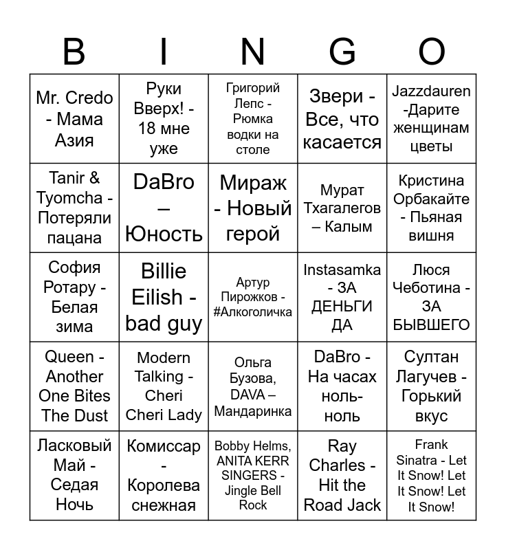 This bingo card has a free space and 24 words: Modern Talking - Cheri Cheri Lady, Комиссар - Королева снежная, Мираж - Новый герой, Ласковый Май - Седая Ночь, Jazzdauren -Дарите женщинам цветы, Mr. Credo - Мама Азия, Tanir & Tyomcha - Потеряли пацана, Руки Вверх! - 18 мне уже, Instasamka - ЗА ДЕНЬГИ ДА, Ольга Бузова, DAVA – Мандаринка, Мурат Тхагалегов – Калым, София Ротару - Белая зима, DaBro - На часах ноль-ноль, Султан Лагучев - Горький вкуc, DaBro – Юность, Ray Charles - Hit the Road Jack, Люся Чеботина - ЗА БЫВШЕГО, Григорий Лепс - Рюмка водки на столе, Кристина Орбакайте - Пьяная вишня, Billie Eilish - bad guy, Frank Sinatra - Let It Snow! Let It Snow! Let It Snow!, Queen - Another One Bites The Dust, Звери - Все, что касается and Bobby Helms, ANITA KERR SINGERS - Jingle Bell Rock.