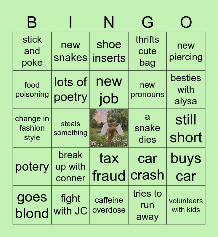 This bingo card has a free space and 24 words: break up with conner, fight with JC, new job, goes blond, new piercing, stick and poke, food poisoning, new snakes, a snake dies, tax fraud, new pronouns, change in fashion style, car crash, buys car, lots of poetry, tries to run away, still short, shoe inserts, besties with alysa, steals something, volunteers with kids, potery, thrifts cute bag and caffeine overdose.