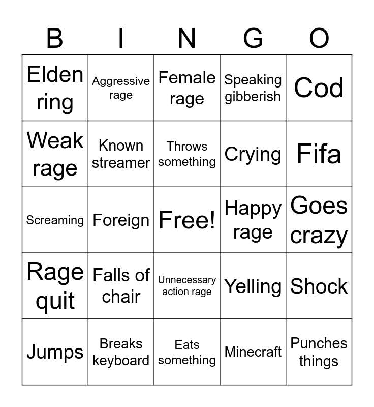 This bingo card has a free space and 24 words: Falls of chair, Breaks keyboard, Throws something, Jumps, Cod, Elden ring, Weak rage, Aggressive rage, Happy rage, Unnecessary action rage, Crying, Screaming, Yelling, Shock, Known streamer, Minecraft, Goes crazy, Female rage, Fifa, Foreign, Punches things, Rage quit, Speaking gibberish and Eats something.