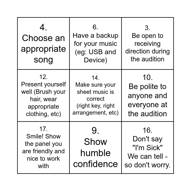 This bingo card has 17 words: 11. Take your time - Don't rush your audition, 2. Know your song 110%, 3. Be open to receiving direction during the audition, 4. Choose an appropriate song, 5. Pick an appropriate character to audition for, 12. Present yourself well (Brush your hair, wear appropriate clothing, etc), 15. Be familiar with all resources that are available to you, 17. Smile! Show the panel you are friendly and nice to work with, 9. Show humble confidence, 10. Be polite to anyone and everyone at the audition, 1. Arrive 15 minutes early, 13. Bring your own speaker (If you have one) just in case!, 14. Make sure your sheet music is correct (right key, right arrangement, etc), 6. Have a backup for your music (eg: USB and Device), 16. Don't say "I'm Sick" We can tell - so don't worry., 8. Do research on the show & character you are auditioning for and 7. Make bold acting choices.