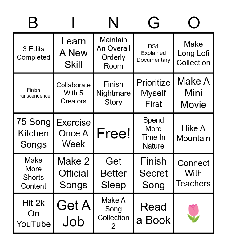 This bingo card has a free space and 24 words: Make 2 Official Songs, Get A Job, Finish Nightmare Story, Hit 2k On YouTube, Make Long Lofi Collection, 3 Edits Completed, Finish Transcendence, Learn A New Skill, Spend More Time In Nature, Get Better Sleep, Prioritize Myself First, 75 Song Kitchen Songs, Finish Secret Song, Connect With Teachers, Collaborate With 5 Creators, Read a Book, Hike A Mountain, Maintain An Overall Orderly Room, Make A Mini Movie, Exercise Once A Week, 🌷, Make More Shorts Content, DS1 Explained Documentary and Make A Song Collection 2.