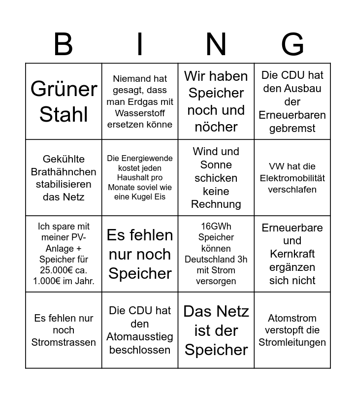 This bingo card has 16 words: Die CDU hat den Atomausstieg beschlossen, Erneuerbare und Kernkraft ergänzen sich nicht, Wir haben Speicher noch und nöcher, Grüner Stahl, Ich spare mit meiner PV-Anlage + Speicher für 25.000€ ca. 1.000€ im Jahr., Niemand hat gesagt, dass man Erdgas mit Wasserstoff ersetzen könne, 16GWh Speicher können Deutschland 3h mit Strom versorgen, Das Netz ist der Speicher, Gekühlte Brathähnchen stabilisieren das Netz, Die Energiewende kostet jeden Haushalt pro Monate soviel wie eine Kugel Eis, Es fehlen nur noch Stromstrassen, Die CDU hat den Ausbau der Erneuerbaren gebremst, Es fehlen nur noch Speicher, VW hat die Elektromobilität verschlafen, Wind und Sonne schicken keine Rechnung and Atomstrom verstopft die Stromleitungen.