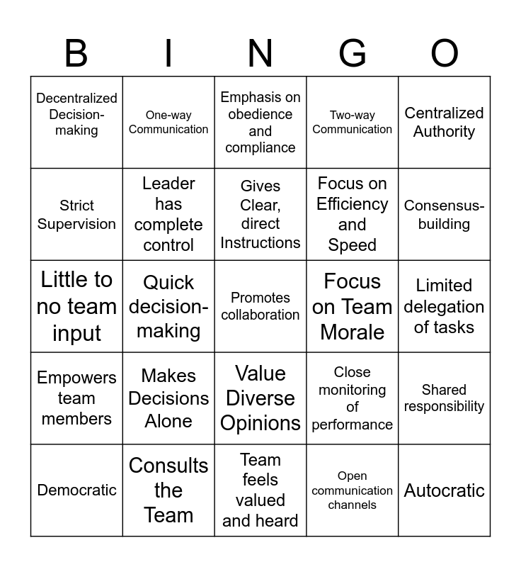 This bingo card has a free space and 24 words: Makes Decisions Alone, Consults the Team, Gives Clear, direct Instructions, Democratic, Centralized Authority, Decentralized Decision-making, Strict Supervision, One-way Communication, Focus on Team Morale, Value Diverse Opinions, Focus on Efficiency and Speed, Little to no team input, Close monitoring of performance, Shared responsibility, Leader has complete control, Open communication channels, Limited delegation of tasks, Emphasis on obedience and compliance, Consensus-building, Quick decision-making, Autocratic, Empowers team members, Two-way Communication and Team feels valued and heard.