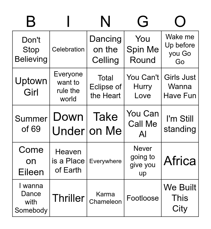 This bingo card has a free space and 24 words: Heaven is a Place of Earth, Thriller, Total Eclipse of the Heart, I wanna Dance with Somebody, Wake me Up before you Go Go, Don't Stop Believing, Uptown Girl, Celebration, You Can Call Me Al, Everywhere, You Can't Hurry Love, Summer of 69, Never going to give you up, Africa, Everyone want to rule the world, Footloose, I'm Still standing, Dancing on the Celling, Girls Just Wanna Have Fun, Down Under, We Built This City, Come on Eileen, You Spin Me Round and Karma Chameleon.