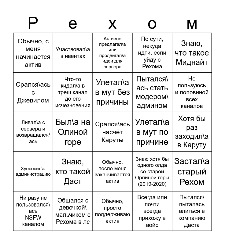 This bingo card has 25 words: Знаю, кто такой Даст, Обычно, просто поддерживаю актив, Улетал\а в мут без причины, Ни разу не пользовался\ ась NSFW каналом, Знаю, что такое Миднайт, Обычно, с меня начинается актив, Срался\ась с Джевилом, Участвовал\а в ивентах, Улетал\а в мут по причине, Обычно, после меня заканчивается актив, Пытался\ ась стать модером\ админом, Ливал\а с сервера и возвращался/ась, Знаю хотя бы одного олда со старой Орлиной горы (2019-2020), Застал\а старый Рехом, Что-то кидал\а в треш канал до его исчезновения, Пытался/пыталась влиться в компанию Даста, Хотя бы раз заходил\а в Каруту, Активно предлагал\а или продвигал\а идеи для сервера, Не пользуюсь и половиной всех каналов, Был\а на Олиной горе, Срался\ась насчёт Каруты, Общался с девочкой\ мальчиком с Рехома в лс, Хуесосил\а администрацию, По сути, некуда идти, если уйду с Рехома and Всегда или почти всегда прихожу в войс.