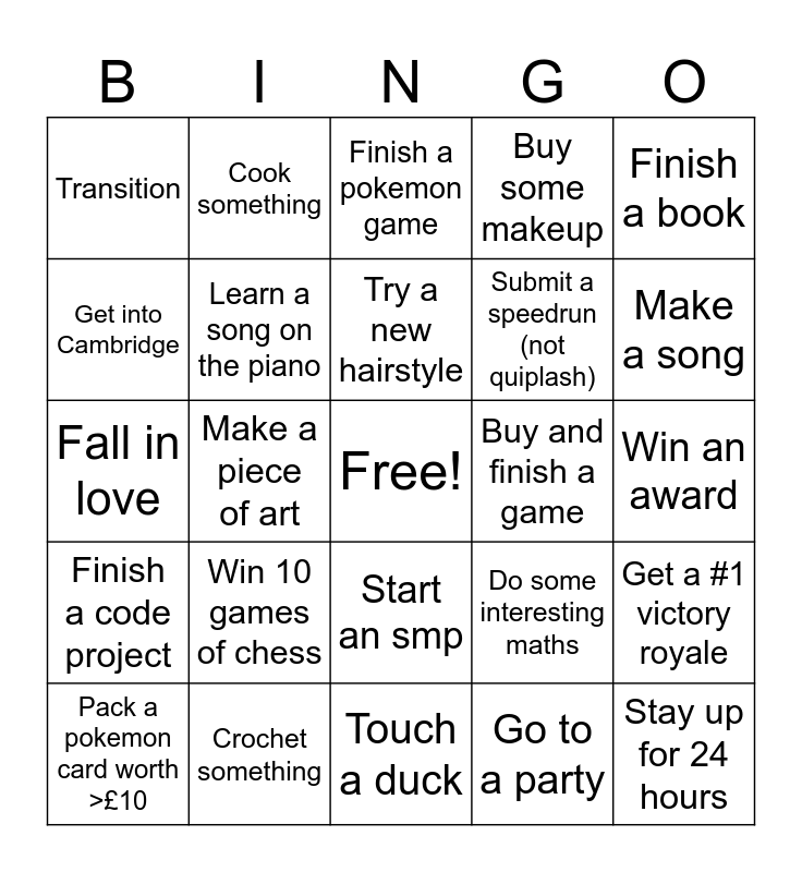 This bingo card has a free space and 24 words: Win 10 games of chess, Crochet something, Try a new hairstyle, Pack a pokemon card worth >£10, Finish a book, Transition, Get into Cambridge, Cook something, Buy and finish a game, Start an smp, Submit a speedrun (not quiplash), Fall in love, Do some interesting maths, Get a #1 victory royale, Learn a song on the piano, Go to a party, Win an award, Finish a pokemon game, Make a song, Make a piece of art, Stay up for 24 hours, Finish a code project, Buy some makeup and Touch a duck.
