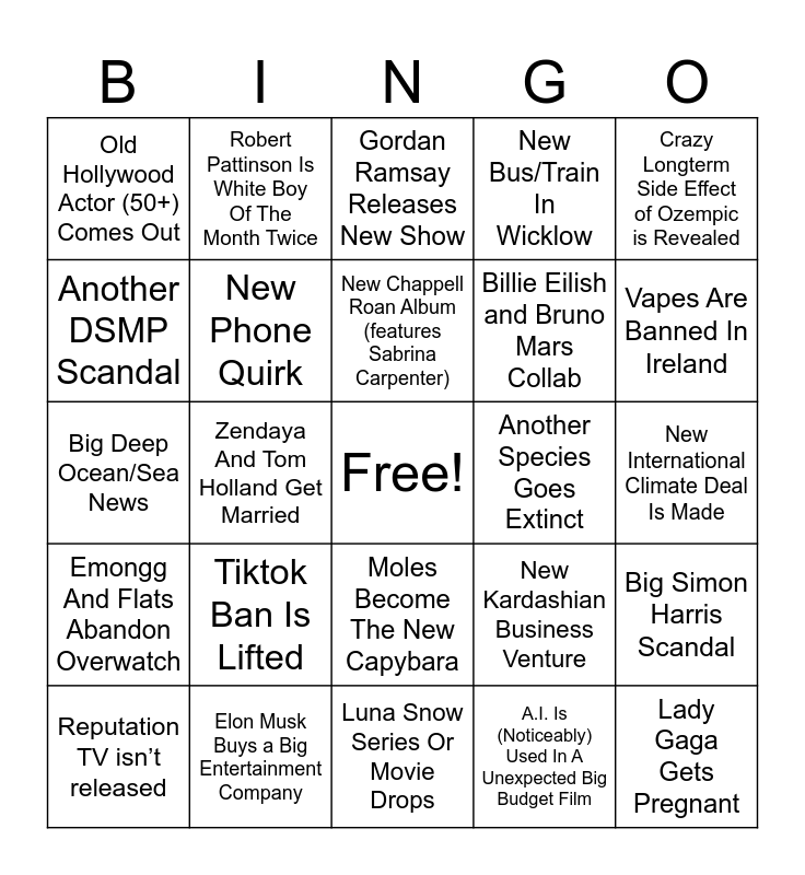 This bingo card has a free space and 24 words: Tiktok Ban Is Lifted, Elon Musk Buys a Big Entertainment Company, New Chappell Roan Album (features Sabrina Carpenter), Reputation TV isn’t released, Crazy Longterm Side Effect of Ozempic is Revealed, Old Hollywood Actor (50+) Comes Out, Another DSMP Scandal, Robert Pattinson Is White Boy Of The Month Twice, Another Species Goes Extinct, Moles Become The New Capybara, Billie Eilish and Bruno Mars Collab, Big Deep Ocean/Sea News, New Kardashian Business Venture, Big Simon Harris Scandal, New Phone Quirk, A.I. Is (Noticeably) Used In A Unexpected Big Budget Film, New International Climate Deal Is Made, Gordan Ramsay Releases New Show, Vapes Are Banned In Ireland, Zendaya And Tom Holland Get Married, Lady Gaga Gets Pregnant, Emongg And Flats Abandon Overwatch, New Bus/Train In Wicklow and Luna Snow Series Or Movie Drops.