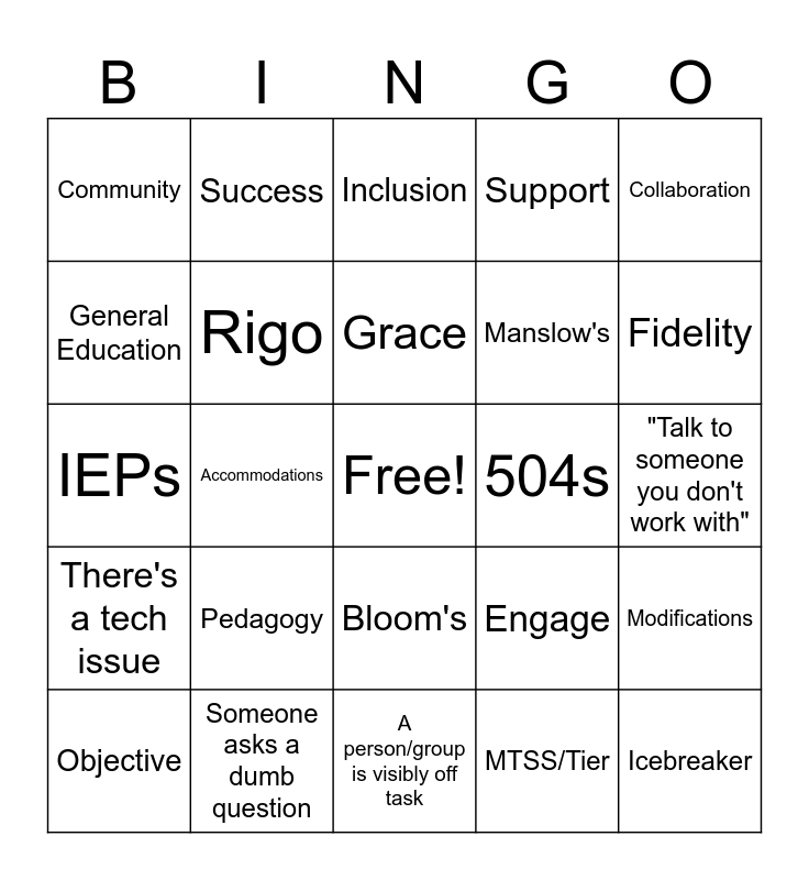 This bingo card has a free space and 24 words: Pedagogy, Someone asks a dumb question, Grace, Objective, Collaboration, Community, General Education, Success, 504s, Bloom's, Manslow's, IEPs, Engage, Modifications, Rigo, MTSS/Tier, "Talk to someone you don't work with", Inclusion, Fidelity, Accommodations, Icebreaker, There's a tech issue, Support and A person/group is visibly off task.
