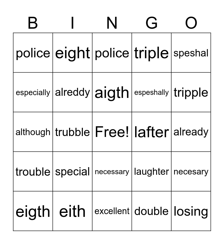 This bingo card has a free space and 24 words: special, eith, aigth, eigth, speshal, police, especially, eight, lafter, necessary, espeshally, although, laughter, necesary, alreddy, double, already, police, tripple, trubble, losing, trouble, triple and excellent.