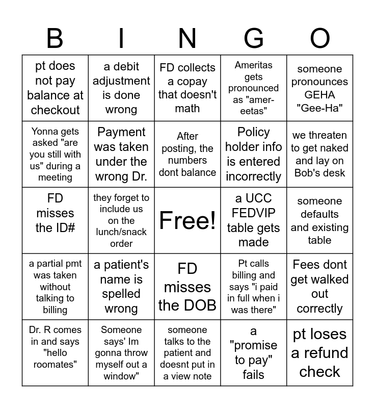 This bingo card has a free space and 24 words: a patient's name is spelled wrong, Someone says' Im gonna throw myself out a window", After posting, the numbers dont balance, Dr. R comes in and says "hello roomates", someone pronounces GEHA "Gee-Ha", pt does not pay balance at checkout, Yonna gets asked "are you still with us" during a meeting, a debit adjustment is done wrong, a UCC FEDVIP table gets made, FD misses the DOB, Policy holder info is entered incorrectly, FD misses the ID#, Pt calls billing and says "i paid in full when i was there", Fees dont get walked out correctly, Payment was taken under the wrong Dr., a "promise to pay" fails, someone defaults and existing table, FD collects a copay that doesn't math, we threaten to get naked and lay on Bob's desk, they forget to include us on the lunch/snack order, pt loses a refund check, a partial pmt was taken without talking to billing, Ameritas gets pronounced as "amer-eetas" and someone talks to the patient and doesnt put in a view note.