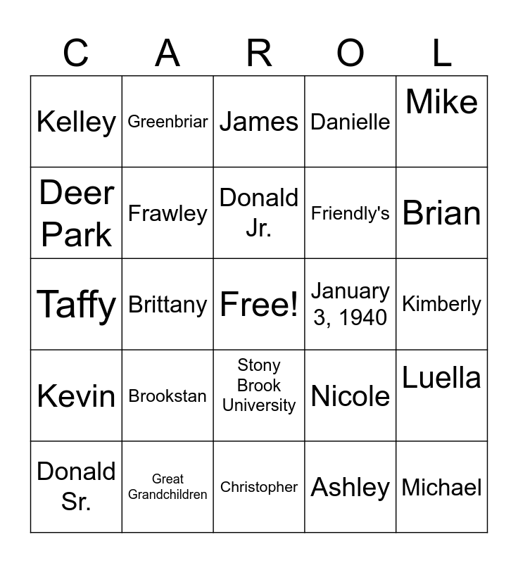 This bingo card has a free space and 24 words: Brookstan, Great Grandchildren, Donald Jr., Donald Sr., Mike, Kelley, Deer Park, Greenbriar, January 3, 1940, Stony Brook University, Friendly's, Taffy, Nicole, Luella, Frawley, Ashley, Kimberly, James, Brian, Brittany, Michael, Kevin, Danielle and Christopher.
