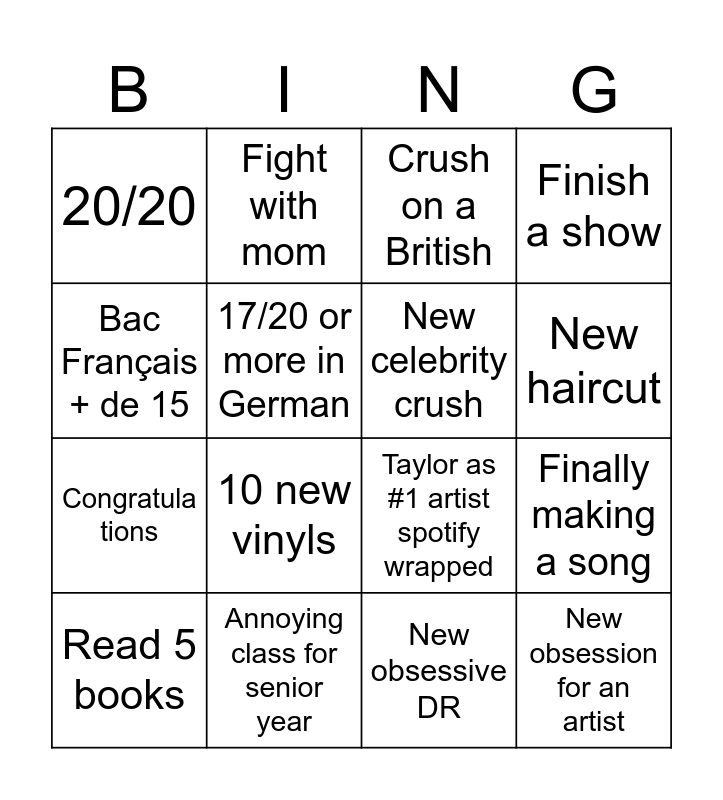 This bingo card has 20 words: Finally making a song, Couple or advanced talking stage, Crush on a British, Celeb crush getting in a relationship, Read 5 books, Bac Français + de 15, Annoying class for senior year, 20/20, Congratula tions, Fight with mom, 10 new vinyls, Taylor as #1 artist spotify wrapped, 17/20 or more in German, New obsession for an artist, New celebrity crush, New IRL crush, New haircut, Finish a show, New obsessive DR and New fav sweater.