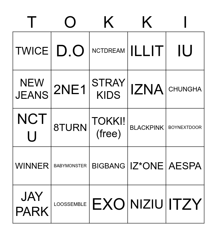 This bingo card has a free space and 48 words: TXT, ITZY, BTS, EXO, BABYMONSTER, KAI, D.O, SEVENTEEN, NEW JEANS, LEE YOUNGJI, 2NE1, ILLIT, AESPA, IZ*ONE, ICHILLIN, WEEEKLY, STRAY KIDS, BLACKPINK, IVE, IU, 8TURN, NIZIU, TWICE, IZNA, 4MINUTE, CHUNGHA, JAY PARK, J.Y.P, BIGBANG, WINNER, LE SSERAFIM, FROMIS_9, LOONA, ARTMS, LOOSSEMBLE, ENHYPEN, THE BOYZ, BOYNEXTDOOR, KEP1ER, NMIXX, RIIZE, NCT127, NCTDREAM, NCT WISH, NCT U, TAEYONG, TEN and WAYV.