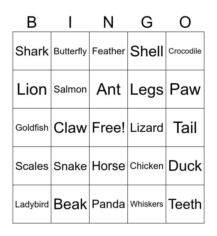 This bingo card has a free space and 25 words: Snake, Panda, Ant, Ladybird, Crocodile, Shark, Lion, Butterfly, Lizard, Horse, Legs, Goldfish, Chicken, Duck, Salmon, Penguin, Tail, Feather, Paw, Claw, Teeth, Beak, Scales, Shell and Whiskers.