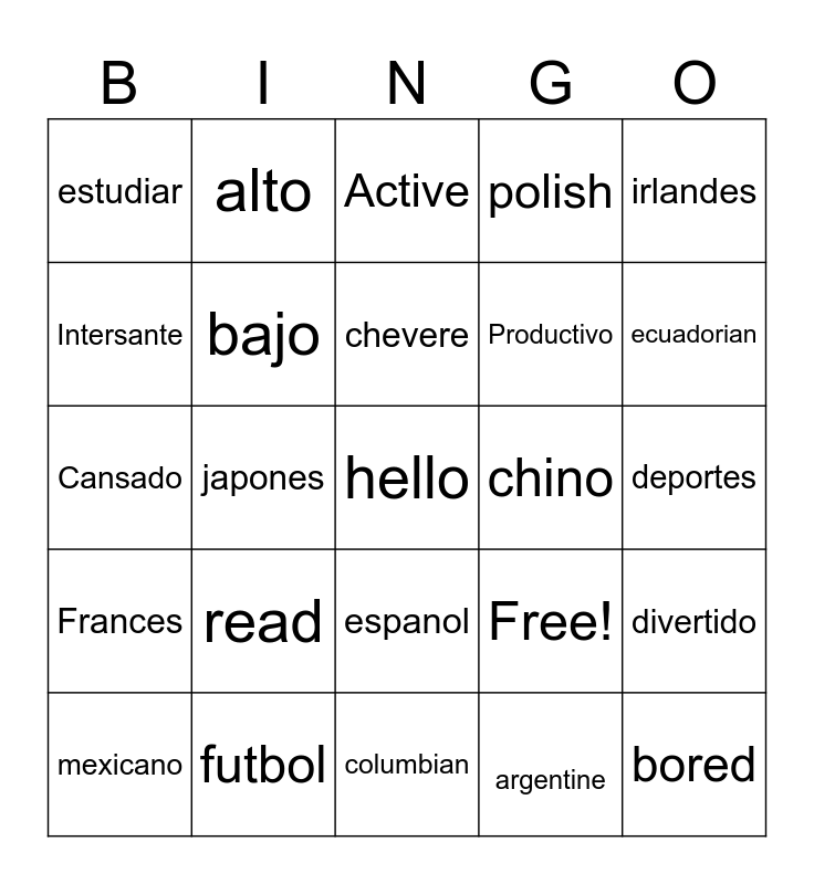 This bingo card has 25 words: read, columbian, chevere, mexicano, irlandes, estudiar, Intersante, alto, chino, espanol, Productivo, Cansado, Free!, divertido, bajo, bored, deportes, Active, ecuadorian, japones, hello, futbol, Frances, polish and argentine.
