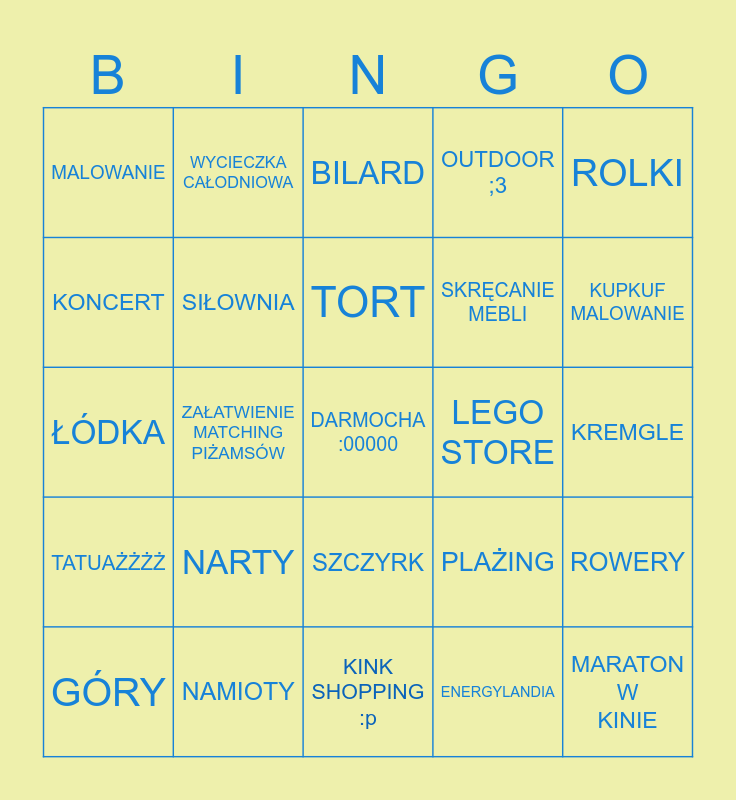 This bingo card has a free space and 24 words: NARTY, NAMIOTY, TORT, GÓRY, ROLKI, MALOWANIE, KONCERT, WYCIECZKA CAŁODNIOWA, LEGO STORE, SZCZYRK, SKRĘCANIE MEBLI, ŁÓDKA, PLAŻING, ROWERY, SIŁOWNIA, ENERGYLANDIA, KREMGLE, BILARD, KUPKUF MALOWANIE, ZAŁATWIENIE MATCHING PIŻAMSÓW, MARATON W KINIE, TATUAŻŻŻŻ, OUTDOOR ;3 and KINK SHOPPING :p.