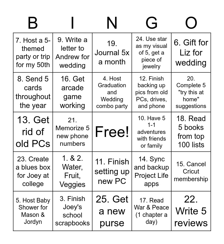 This bingo card has a free space and 24 words: 1. & 2. Water, Fruit, Veggies, 3. Finish Joey's school scrapbooks, 4. Host Graduation and Wedding combo party, 5. Host Baby Shower for Mason & Jordyn, 6. Gift for Liz for wedding, 7. Host a 5-themed party or trip for my 50th, 8. Send 5 cards throughout the year, 9. Write a letter to Andrew for wedding, 10. Have 5 1-1 adventures with friends or family, 11. Finish setting up new PC, 12. Finish backing up pics from old PCs, drives, and phone, 13. Get rid of old PCs, 14. Sync and backup Project Life apps, 15. Cancel Cricut membership, 16. Get arcade game working, 17. Read War & Peace (1 chapter a day), 18. Read 5 books from top 100 lists, 19. Journal 5x a month, 20. Complete 5 "try this at home" suggestions, 21. Memorize 5 new phone numbers, 22. Write 5 reviews, 23. Create a blues box for Joey at college, 24. Use star as my visual of 5, get a piece of jewelry and 25. Get a new purse.