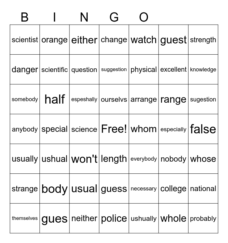 This bingo card has a free space and 48 words: necessary, excellent, police, special, espeshally, false, orange, gues, guest, length, strength, change, range, arrange, strange, especially, danger, knowledge, college, watch, physical, science, scientist, scientific, national, question, sugestion, themselves, ourselvs, half, whole, whom, whose, body, anybody, everybody, nobody, somebody, won't, usual, usually, probably, either, neither, suggestion, guess, ushual and ushually.