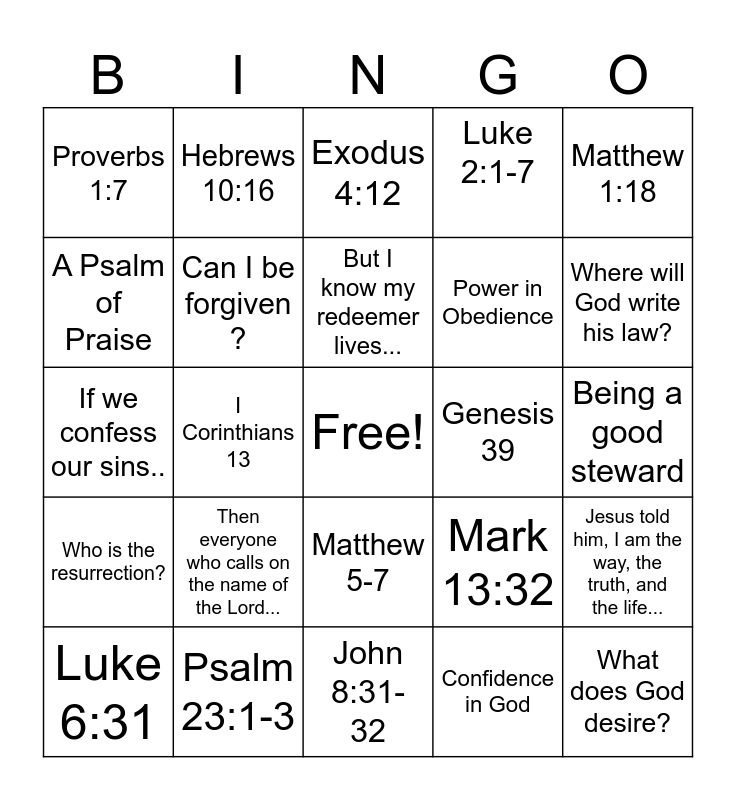 This bingo card has a free space and 35 words: Deuteronomy 4:7, Exodus 19:5, John 17:3, Can I be forgiven ?, Matthew 5-7, Luke 2:1-7, A Psalm of Praise, Genesis 12:3, But I know my redeemer lives..., I Thess 4:17, If we confess our sins.., Matthew 1:18, How should I live?, How can I bear fruit?, Proverbs 1:7, Genesis 39, Confidence in God, I Corinthians 13, Who is the resurrection?, What does God desire?, Mark 13:32, Luke 6:31, Jesus told him, I am the way, the truth, and the life..., Psalm 23:1-3, Exodus 4:12, Where will God write his law?, How are we like sheep?, Nehemiah 4-6, Power in Obedience, Being a good steward, John 3:1-21, John 8:31-32, Then everyone who calls on the name of the Lord..., Hebrews 10:16 and Wine is a mocker....