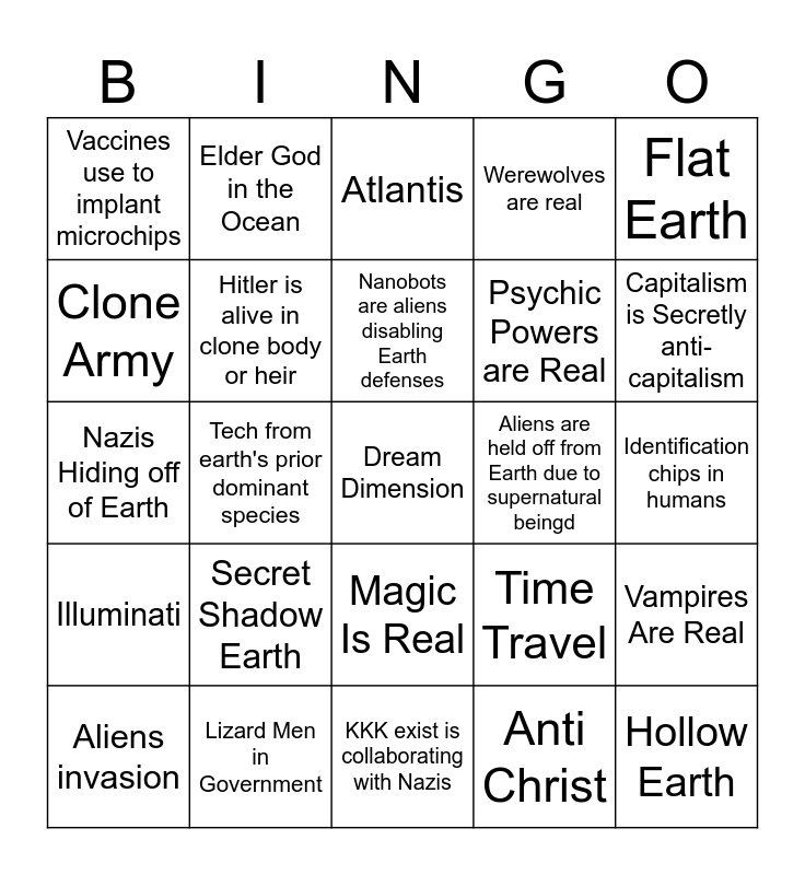 This bingo card has a free space and 24 words: Secret Shadow Earth, Lizard Men in Government, Nanobots are aliens disabling Earth defenses, Aliens invasion, Flat Earth, Vaccines use to implant microchips, Clone Army, Elder God in the Ocean, Aliens are held off from Earth due to supernatural beingd, Magic Is Real, Psychic Powers are Real, Nazis Hiding off of Earth, Time Travel, Vampires Are Real, Hitler is alive in clone body or heir, Anti Christ, Identification chips in humans, Atlantis, Capitalism is Secretly anti-capitalism, Tech from earth's prior dominant species, Hollow Earth, Illuminati, Werewolves are real and KKK exist is collaborating with Nazis.