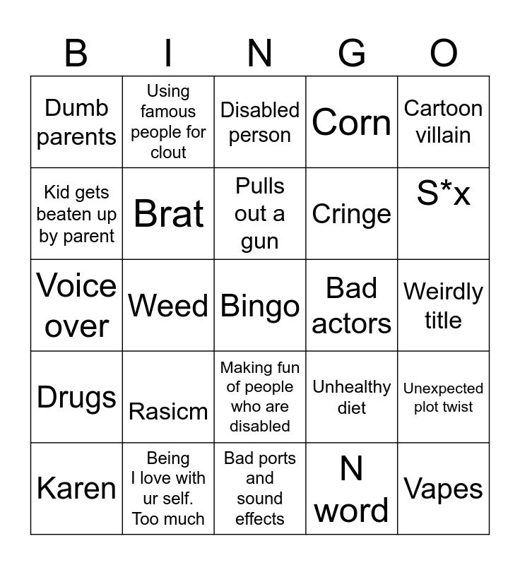 This bingo card has a free space and 24 words: Rasicm, Being I love with ur self. Too much, Pulls out a gun, Karen, Cartoon villain, Dumb parents, Kid gets beaten up by parent, Using famous people for clout, Bad actors, Making fun of people who are disabled, Cringe, Voice over, Unhealthy diet, Unexpected plot twist, Brat, N word, Weirdly title, Disabled person, S*x, Weed, Vapes, Drugs, Corn and Bad ports and sound effects.