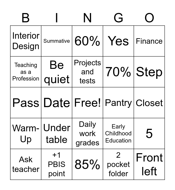 This bingo card has a free space and 39 words: Throw trash like basketballs, CATS Creed, -1 PBIS point, Be quiet, Ask teacher, Daily work grades, Projects and tests, Culinary Arts, Finance, Warm-Up, Date, Yes, Front left, Closet, Pantry, Under table, No, Interior Design, Fashion Design, Early Childhood Education, Teaching as a Profession, 85%, 70%, Step, Broken up, Grey bin, Colored class bin, Sign out, Seating chart, Summative, Formative, 40%, 60%, +1 PBIS point, 2 pocket folder, Missing assignments, 5, Pass and Get up and walk around.