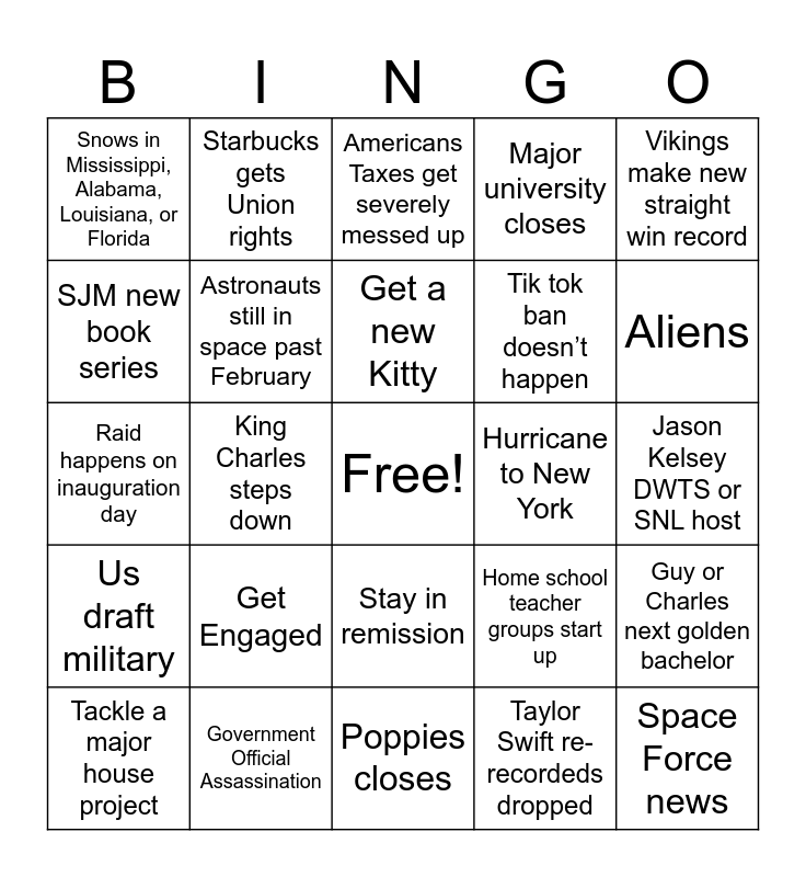 This bingo card has a free space and 24 words: Get Engaged, Government Official Assassination, Get a new Kitty, Tackle a major house project, Vikings make new straight win record, Snows in Mississippi, Alabama, Louisiana, or Florida, SJM new book series, Starbucks gets Union rights, Hurricane to New York, Stay in remission, Tik tok ban doesn’t happen, Raid happens on inauguration day, Home school teacher groups start up, Guy or Charles next golden bachelor, Astronauts still in space past February, Taylor Swift re-recordeds dropped, Jason Kelsey DWTS or SNL host, Americans Taxes get severely messed up, Aliens, King Charles steps down, Space Force news, Us draft military, Major university closes and Poppies closes.
