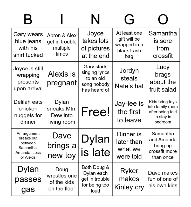 This bingo card has a free space and 24 words: Dave brings a new toy, Doug wrestles one of the kids on the floor, Gary starts singing lyrics to an old song nobody has heard of, Dylan passes gas, Samantha is sore from crossfit, Gary wears blue jeans with his shirt tucked, Joyce is still wrapping presents upon arrival, Abron & Alex get in trouble multiple times, Jay-lee is the first to leave, Dylan is late, Jordyn steals Nate’s hat, Delilah eats chicken nuggets for dinner, Dinner is later than what we were told, Samantha and Amanda bring up crossfit more than once, Alexis is pregnant, Ryker makes Kinley cry, Kids bring toys into family room after being told to stay in bedroom, Joyce takes lots of pictures at the end, Lucy brags about the fruit salad, Dylan sneaks Mtn. Dew into living room, Dave makes fun of one of his own kids, An argument breaks out between Samantha, Amanda, Jess or Alexis, At least one gift will be wrapped in a black trash bag and Both Doug & Dylan each get in trouble for being too loud.