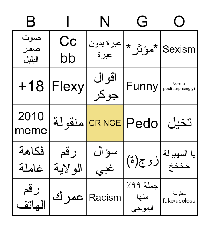 This bingo card has a free space and 24 words: رقم الهاتف, رقم الولاية, اقوال جوكر, جملة ٩٩٪ منها ايموجي, Sexism, صوت صفير البلبل, Cc bb, عبرة بدون عبرة, Pedo, تخيل, 2010 meme, Flexy, زوج(ة), يا المهبولة خخخخ, +18, عمرك, Racism, *مؤثر*, Normal post(surprisingly), فكاهة غاملة, منقولة, سؤال غبي, Funny and معلومة fake/useless.