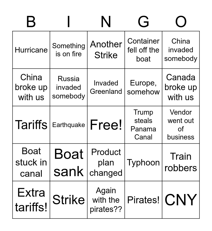 This bingo card has a free space and 24 words: Boat sank, Strike, Invaded Greenland, Extra tariffs!, China invaded somebody, Hurricane, China broke up with us, Something is on fire, Trump steals Panama Canal, Product plan changed, Europe, somehow, Tariffs, Typhoon, Train robbers, Russia invaded somebody, Pirates!, Vendor went out of business, Another Strike, Canada broke up with us, Earthquake, CNY, Boat stuck in canal, Container fell off the boat and Again with the pirates??.