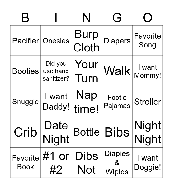 This bingo card has a free space and 25 words: Date Night, Dibs Not, Your Turn, Favorite Book, Favorite Song, Pacifier, Booties, Onesies, Footie Pajamas, Bottle, Walk, Snuggle, Bibs, Night Night, Did you use hand sanitizer?, Swaddle, Stroller, Burp Cloth, I want Mommy!, I want Daddy!, I want Doggie!, #1 or #2, Crib, Diapers and Diapies & Wipies.