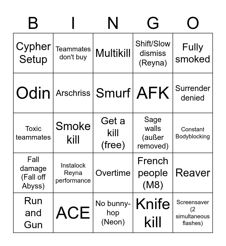 This bingo card has a free space and 24 words: Instalock Reyna performance, ACE, Smurf, Run and Gun, Fully smoked, Cypher Setup, Odin, Teammates don't buy, Sage walls (außer removed), Overtime, AFK, Toxic teammates, French people (M8), Reaver, Arschriss, Knife kill, Constant Bodyblocking, Multikill, Surrender denied, Smoke kill, Screensaver (2 simultaneous flashes), Fall damage (Fall off Abyss), Shift/Slow dismiss (Reyna) and No bunny-hop (Neon).
