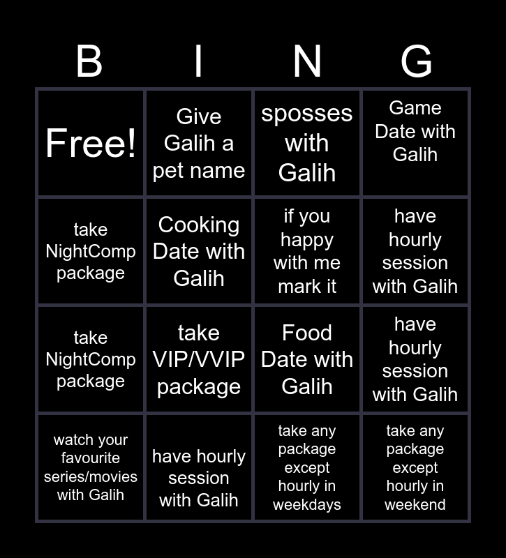 This bingo card has 16 words: watch your favourite series/movies with Galih, have hourly session with Galih, sposses with Galih, Game Date with Galih, take NightComp package, Give Galih a pet name, Food Date with Galih, have hourly session with Galih, Free!, Cooking Date with Galih, take any package except hourly in weekdays, have hourly session with Galih, take NightComp package, take VIP/VVIP package, if you happy with me mark it and take any package except hourly in weekend.