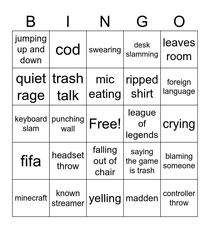 This bingo card has a free space and 24 words: headset throw, known streamer, mic eating, minecraft, leaves room, jumping up and down, quiet rage, cod, league of legends, falling out of chair, ripped shirt, keyboard slam, saying the game is trash, blaming someone, trash talk, madden, crying, swearing, foreign language, punching wall, controller throw, fifa, desk slamming and yelling.