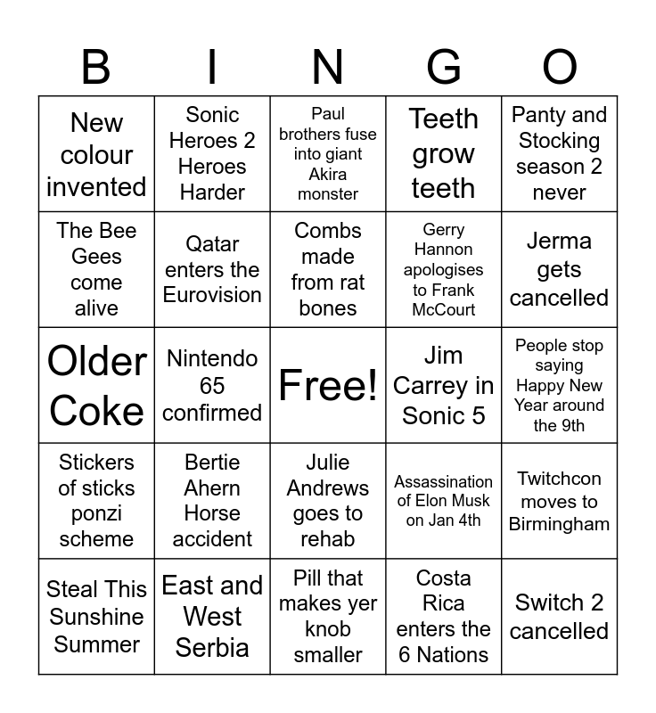 This bingo card has a free space and 24 words: Bertie Ahern Horse accident, East and West Serbia, Combs made from rat bones, Steal This Sunshine Summer, Panty and Stocking season 2 never, New colour invented, The Bee Gees come alive, Sonic Heroes 2 Heroes Harder, Jim Carrey in Sonic 5, Julie Andrews goes to rehab, Gerry Hannon apologises to Frank McCourt, Older Coke, Assassination of Elon Musk on Jan 4th, Twitchcon moves to Birmingham, Qatar enters the Eurovision, Costa Rica enters the 6 Nations, People stop saying Happy New Year around the 9th, Paul brothers fuse into giant Akira monster, Jerma gets cancelled, Nintendo 65 confirmed, Switch 2 cancelled, Stickers of sticks ponzi scheme, Teeth grow teeth and Pill that makes yer knob smaller.