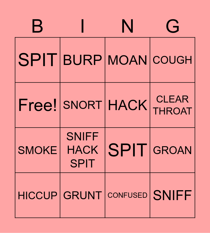 This bingo card has 16 words: GRUNT, GROAN, MOAN, SPIT, SMOKE, BURP, SPIT, CONFUSED, Free!, SNORT, HICCUP, COUGH, SNIFF HACK SPIT, CLEAR THROAT, HACK and SNIFF.