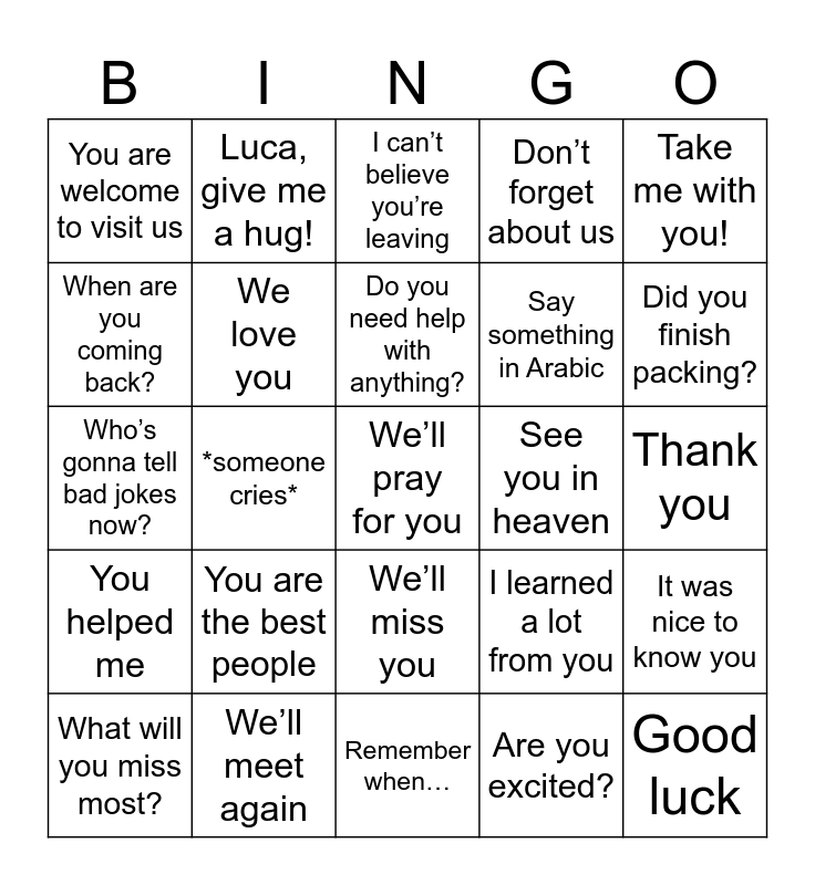 This bingo card has 30 words: We’ll meet again, This is not a goodbye, *someone cries*, How does Luca feel?, You are welcome to visit us, I can’t believe you’re leaving, We love you, We’ll miss you, See you in heaven, Remember when…, Thank you, We’ll pray for you, Are you excited?, Good luck, Did you finish packing?, Send pictures, I learned a lot from you, You helped me, You are the best people, Take me with you!, Who’s gonna tell bad jokes now?, I’m only gonna miss Luca, Luca, give me a hug!, Say something in Arabic, When are you coming back?, Don’t forget about us, It was nice to know you, What will you miss most?, Do you need help with anything? and Were you surprised?.