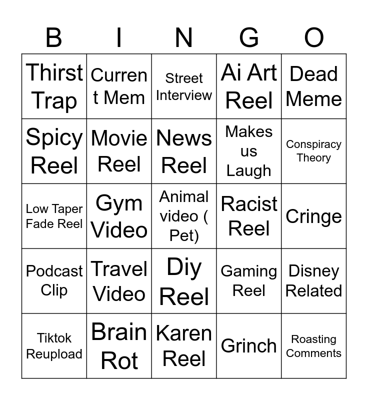 This bingo card has 25 words: Travel Video, Karen Reel, News Reel, Tiktok Reupload, Dead Meme, Thirst Trap, Spicy Reel, Curren t Mem, Racist Reel, Diy Reel, Makes us Laugh, Low Taper Fade Reel, Gaming Reel, Disney Related, Movie Reel, Roasting Comments, Cringe, Street Interview, Conspiracy Theory, Gym Video, Animal video ( Pet), Brain Rot, Podcast Clip, Ai Art Reel and Grinch.