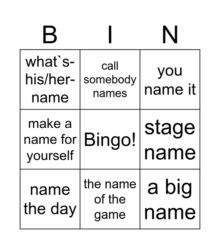 This bingo card has a free space and 8 words: stage name, you name it, call somebody names, name the day, what`s- his/her-name, a big name, make a name for yourself and the name of the game.