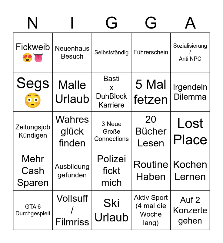 This bingo card has a free space and 24 words: Ausbildung gefunden, Vollsuff / Filmriss, Basti x DuhBlock Karriere, GTA 6 Durchgespielt, Sozialisierung / Anti NPC, Fickweib 😍👅, Segs 😳, Neuenhaus Besuch, 20 Bücher Lesen, Polizei fickt mich, 5 Mal fetzen, Zeitungsjob Kündigen, Routine Haben, Kochen Lernen, Malle Urlaub, Aktiv Sport (4 mal die Woche lang), Lost Place, Selbstständig, Irgendein Dilemma, Wahres glück finden, Auf 2 Konzerte gehen, Mehr Cash Sparen, Führerschein and Ski Urlaub.