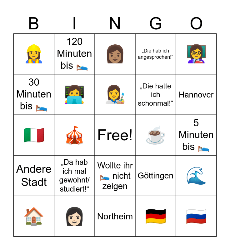 This bingo card has a free space and 29 words: ๐ฉ๐ผ, ๐ฉ๐ป, ๐ฉ๐ฝ, ๐ฉ๐ปโ๐ฆฐ, ๐ฉโ๐ซ, ๐ทโโ๏ธ, ๐ฉโ๐ป, ๐ฉโ๐จ, โ๏ธ, ๐, ๐ , ๐ช, ๐ฉ๐ช, ๐ท๐บ, ๐ฎ๐น, ๐ต๐ฒ, Northeim, Gรถttingen, Hannover, Andere Stadt, โDa hab ich mal gewohnt/ studiert!โ, โDie kenne ich von frรผher!โ, โDie hatte ich schonmal!โ, 5 Minuten bis ๐, 30 Minuten bis ๐, 120 Minuten bis ๐, Wollte ihr ๐ nicht zeigen, โDie hab ich angesprochen!โ and โDie kenne ich vom Sport!โ.