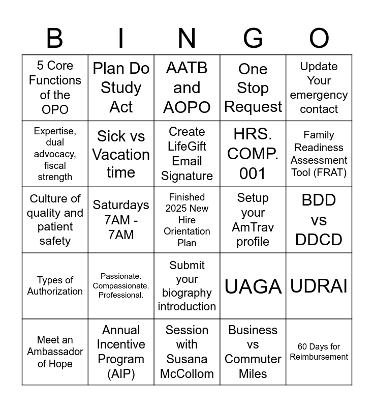 This bingo card has a free space and 24 words: Passionate. Compassionate. Professional., Annual Incentive Program (AIP), Create LifeGift Email Signature, Meet an Ambassador of Hope, Update Your emergency contact, 5 Core Functions of the OPO, Expertise, dual advocacy, fiscal strength, Plan Do Study Act, Setup your AmTrav profile, Submit your biography introduction, HRS. COMP. 001, Culture of quality and patient safety, UAGA, UDRAI, Sick vs Vacation time, Business vs Commuter Miles, BDD vs DDCD, AATB and AOPO, Family Readiness Assessment Tool (FRAT), Saturdays 7AM - 7AM, 60 Days for Reimbursement, Types of Authorization, One Stop Request and Session with Susana McCollom.