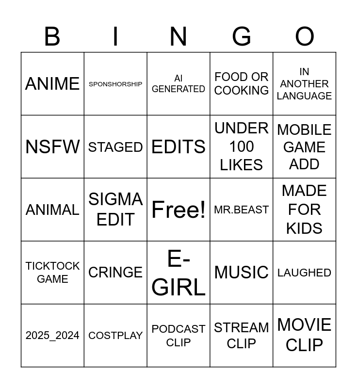 This bingo card has a free space and 24 words: CRINGE, COSTPLAY, EDITS, 2025_2024, IN ANOTHER LANGUAGE, ANIME, NSFW, SPONSHORSHIP, MR.BEAST, E-GIRL, UNDER 100 LIKES, ANIMAL, MUSIC, LAUGHED, STAGED, STREAM CLIP, MADE FOR KIDS, AI GENERATED, MOBILE GAME ADD, SIGMA EDIT, MOVIE CLIP, TICKTOCK GAME, FOOD OR COOKING and PODCAST CLIP.