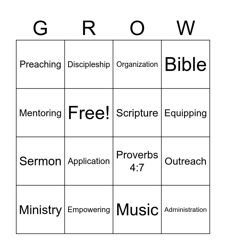 This bingo card has 51 words: Education, Ministry, Wisdom, Knowledge, Teaching, Learning, Discipleship, Understanding, Free!, Growth, Scripture, Bible, God, Jesus, Church, Community, Equipping, Empowering, Training, Mentoring, Outreach, Worship, Preaching, Sermon, Study, Research, Application, Doctrine, Communication, Organization, Accountability, Leadership, Collaboration, Reflection, Innovation, Impact, Strategy, Sunday School, Youth Group, Bible Study, Music, Administration, Community Outreach, Praise, Workshops, Rabbi, Proverbs 4:7, 2 Timothy 2:15, Hosea 4:6, Matthew 28:19-20 and Colossians 3:16.