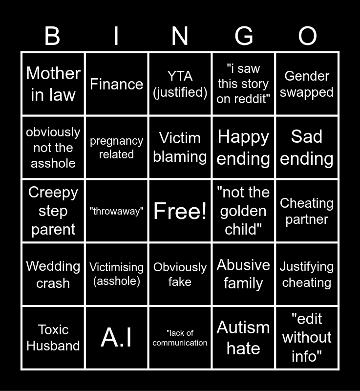 This bingo card has a free space and 24 words: Victimising (asshole), A.I, Victim blaming, Toxic Husband, Gender swapped, Mother in law, obviously not the asshole, Finance, "not the golden child", Obviously fake, Happy ending, Creepy step parent, Abusive family, Justifying cheating, pregnancy related, Autism hate, Cheating partner, YTA (justified), Sad ending, "throwaway", "edit without info", Wedding crash, "i saw this story on reddit" and "lack of communication.