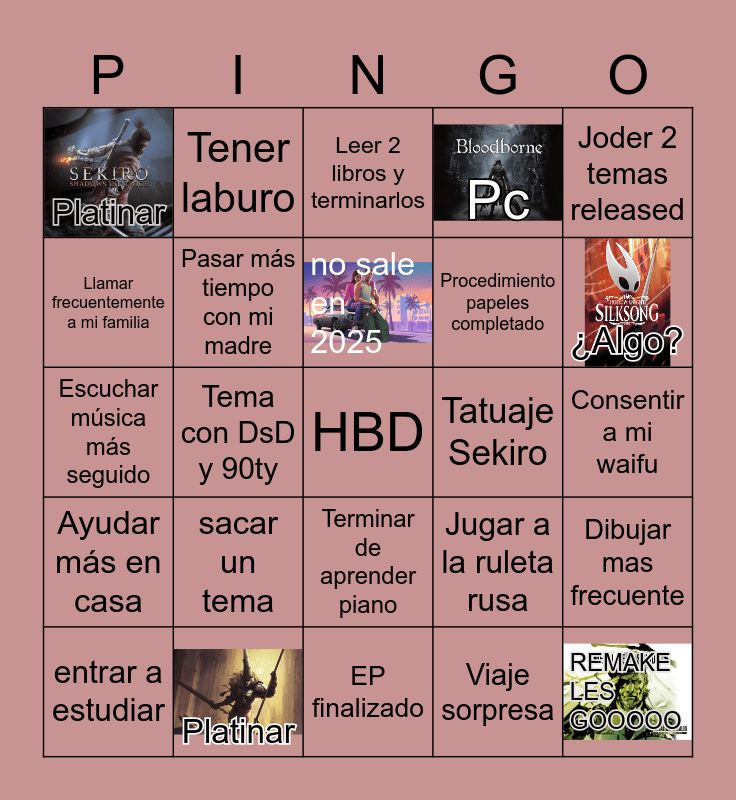 This bingo card has 6 images, a free space and 24 words: sacar un tema, Platinar, no sale en 2025, entrar a estudiar, Joder 2 temas released, Platinar, Llamar frecuentemente a mi familia, Tener laburo, Tatuaje Sekiro, Terminar de aprender piano, Procedimiento papeles completado, Escuchar música más seguido, Jugar a la ruleta rusa, Dibujar mas frecuente, Pasar más tiempo con mi madre, Viaje sorpresa, Consentir a mi waifu, Leer 2 libros y terminarlos, ¿Algo?, Tema con DsD y 90ty, REMAKE LES GOOOOO, Ayudar más en casa, Pc and EP finalizado.